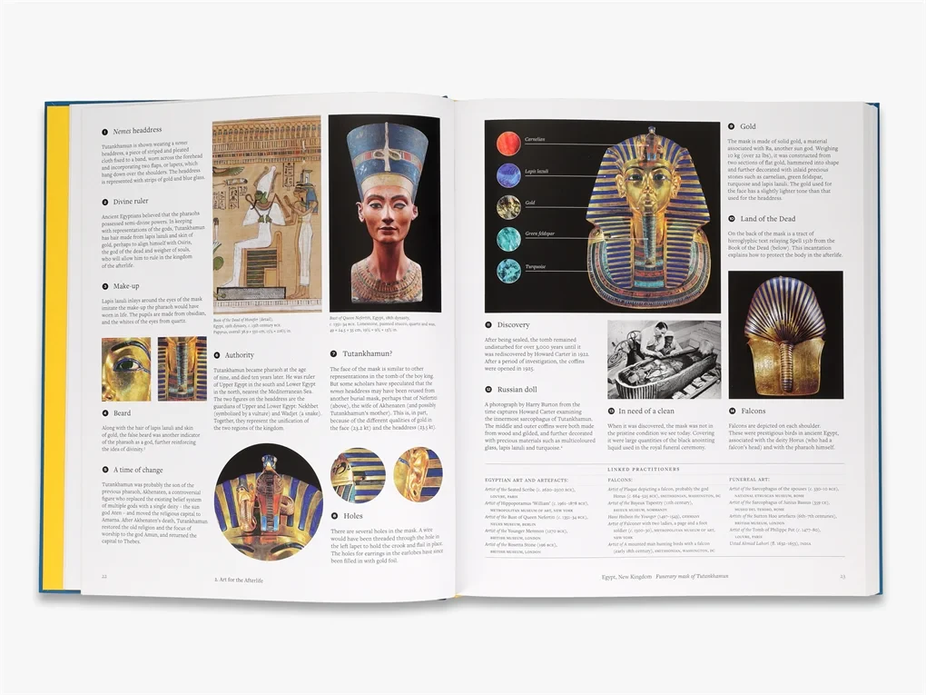 Whether it’s the mask of Tutankhamun or Dorothea Lange’s photograph of Migrant Mother, Hokusai’s Great Wave or Kara Walker’s Gone, each image is dissected on the page in a no-nonsense style, with explanatory notes detailing artists’ sources of inspiration, associated styles and movements, plus any relevant quotes, related visuals and other contextual and issue-led information with keywords for handy cross-referencing.