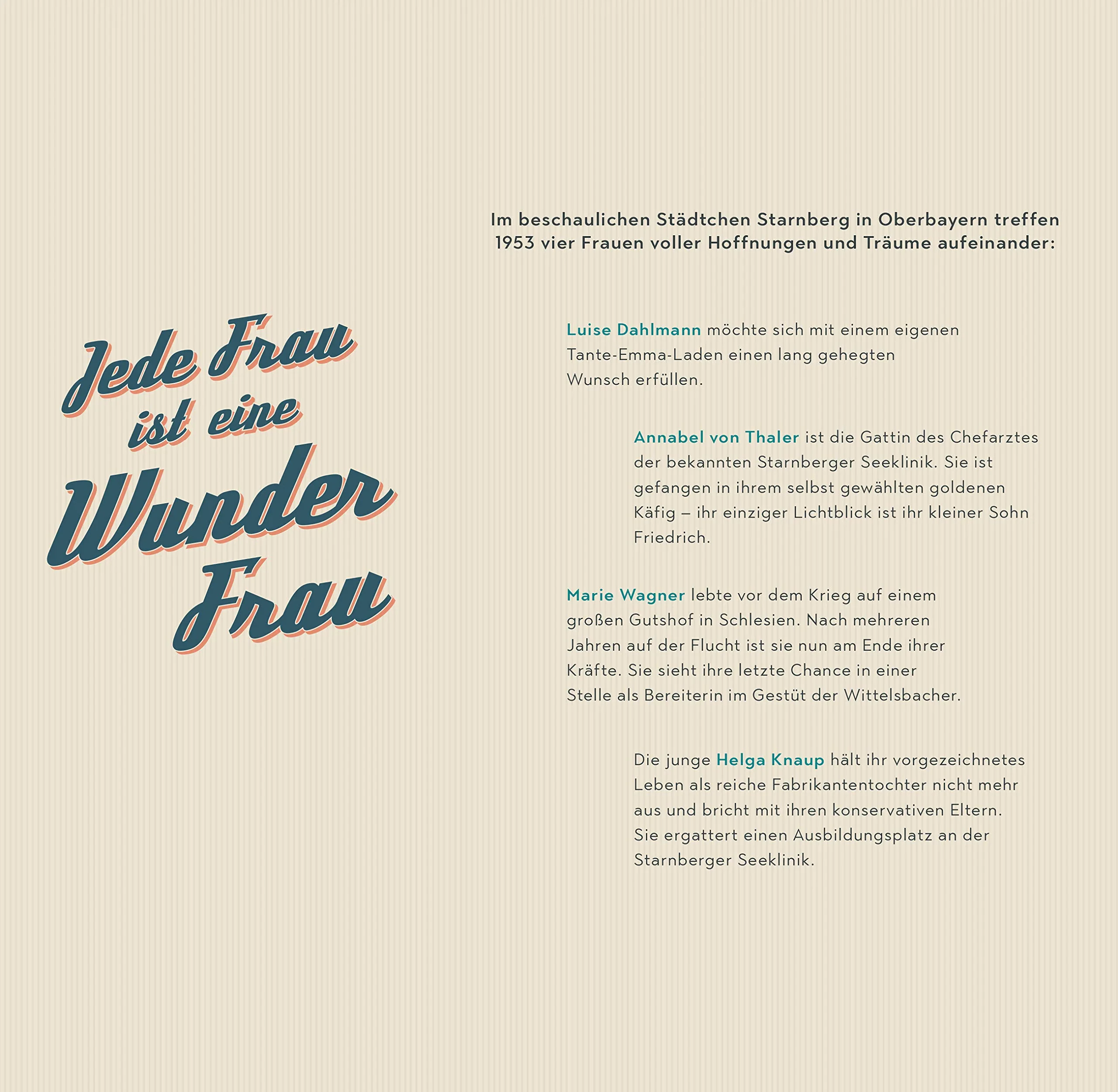 Der erste Band der Wunderfrauen-Trilogie - drei Romane über vier Freundinnen, deren Leben wir über drei Bände von den Wirtschaftswunderjahren Mitte der 1950er bis zu den Olympischen Spielen 1972 begleiten können.