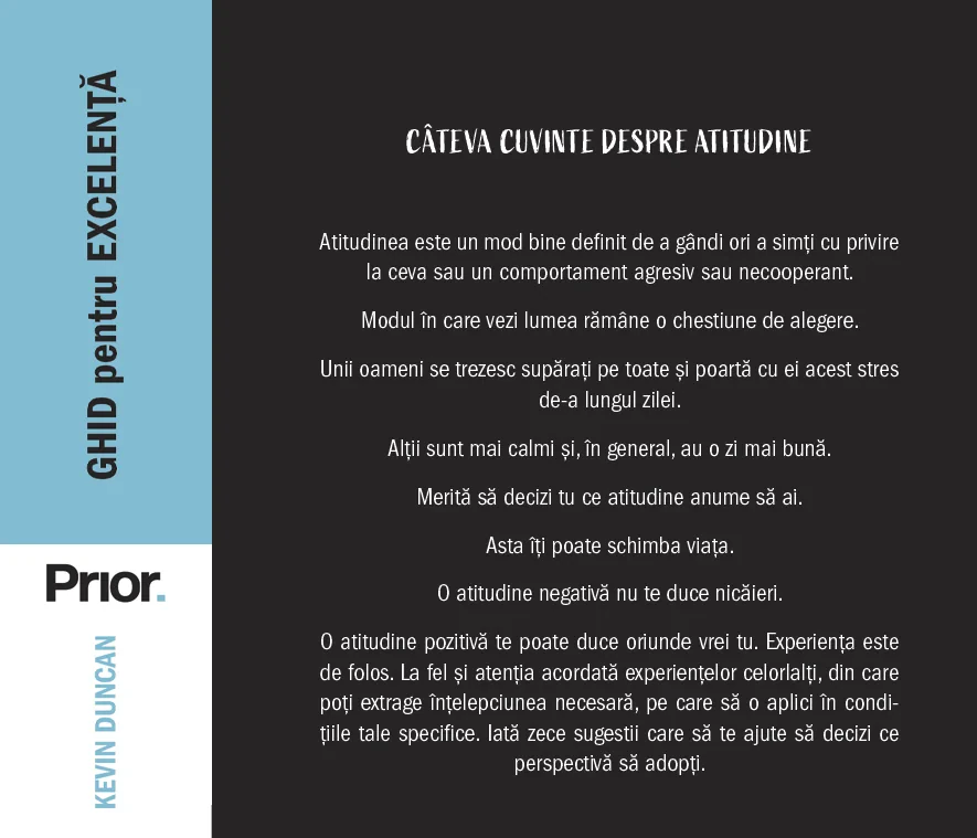 Kevin Duncan, autorul de bestsellere, a reusit din nou sa-si surprinda publicul, reunind 50 de idei ingenioase pentru a-ti perfectiona atitudinea, abordarea asupra vietii si muncii, intrebarile pe care ti le pui, deciziile pe care le iei si chiar si modul in care te sincronizezi.